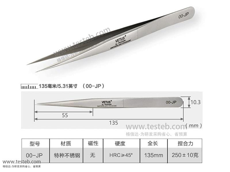 VETUS 00-JP鑷子材質302型特種不銹鋼具有超精細高精密、抗磁防酸、高硬度,中等粗細直尖頭夾持緊密,堅實耐用不易變形,全長135mm,55mm長尖頭用于電子、實驗室夾取,媲美進口鑷子的質量,性價比高,另有短尖型3C-JP、扁平頭2A-JP、細尖頭5SA-JP及鷹嘴彎頭7SA-JP共6種款式滿足不同操作需求。
