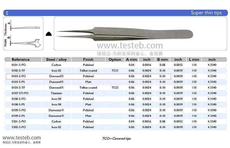 | 0109-5A-PO鑷子 | Dumostar | 0.08mm | 0.13mm | Polished表面拋光,高硬度、耐高溫、防腐蝕,非磁性 |