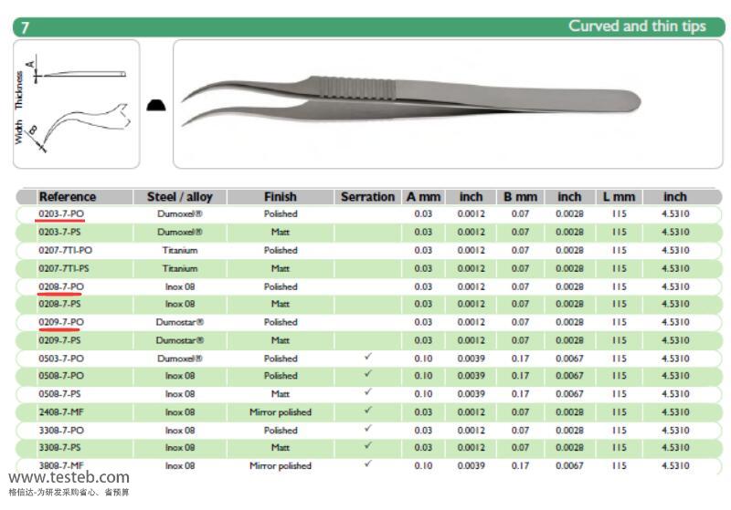 | 0203-7-PO鑷子 | Dumoxel | 0.03mm | 0.07mm | Polished拋光,全長115mm |