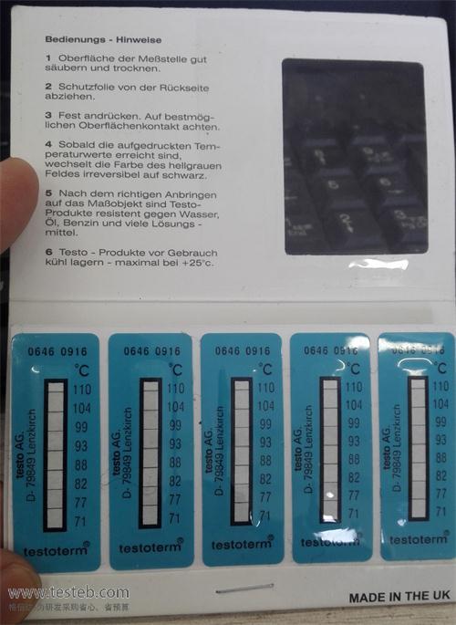 TESTO德圖溫度貼06460916溫度范圍71~110℃,精度±1.5℃,超出溫度量程2、3秒內(nèi)即可改變顏色,自帶粘性,用于移動或微小物體,運輸存儲過程中的長期監(jiān)測的理想選擇。