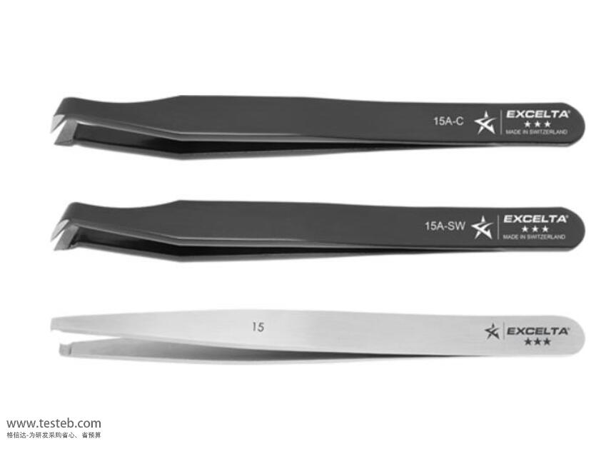 Excelta剪切鑷子主要用于醫療器械制造行業(如助聽器、支架、起搏器)和微型電子領域,15A-GW點剪切系列頭部較長,15A-RW微型頭系列剪切面很窄僅2.4mm可用于密集空間切割。其它特殊變化形式如EXCELTA 15A-C鑷子頭部較短,質量等級3顆星,表面環氧涂層具有ESD防靜電(10? - 10? 0hms/sq)及抗氧化性能。,15A-HT合金鑷子可用來剪不銹鋼絲、鉑金/銅銀線。