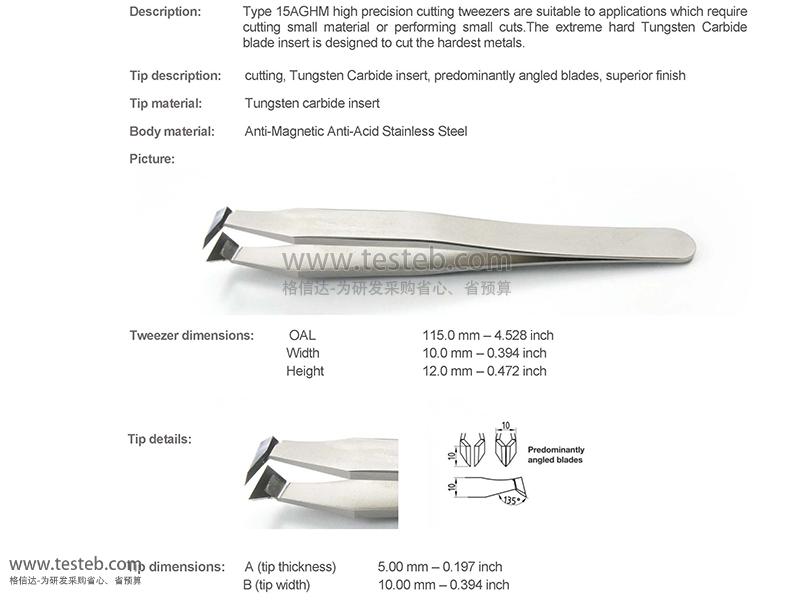 瑞士Ideal-tek 15AGHM.SA剪切鑷子(鑷子握把上印刷型號(hào)是15AGHM.SA,包裝標(biāo)簽15AGHM.SA.0.ITU字樣代碼)主體為SA奧氏體不銹鋼材質(zhì)抗磁防腐蝕,頭部高溫焊接嵌入精確打磨的超硬碳化鎢鋼合金刀刃,75HRC高硬度可用于齊平切割醫(yī)療器械行業(yè)鎳鈦絲、鉑鎢及細(xì)不銹鋼絲,耐磨使用壽命長,頭部前傾有良好的操作視野。Carbide inserts (75 HRc) on antimagnetic stainless steel handle, for very precise cutting of hairsprings. Extended lifetime and high cutting capacity。15AGHM鑷子規(guī)格文檔http://www.jwjzzs.com/download/202302/ideal-tek_15AGHM.SA_Datasheet.pdf。另有15AGHM.SA.NE帶黑色環(huán)氧涂層防靜電潔凈等級(jí)。