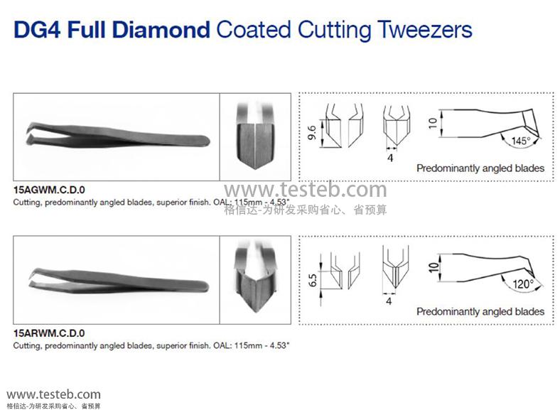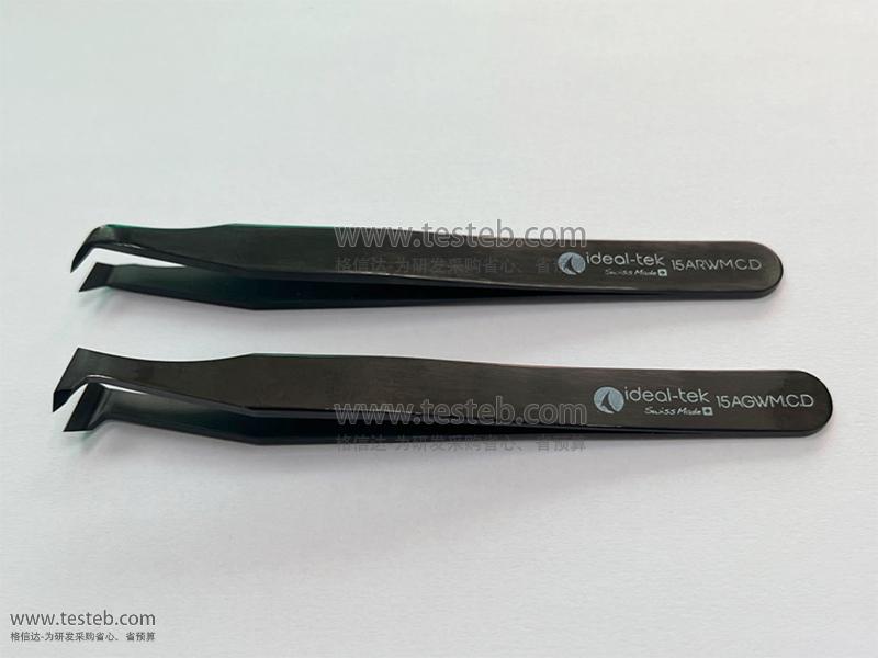 ideal-tek 15AGWM.C.D剪切鑷子鋒利的碳鋼刀刃表面沉積Diamond Coating (DG4)金剛石涂層,具有97HRC超高硬度、高耐磨且防腐蝕防靜電,保持原始的切割鋒利度并延長工具壽命,非常適合醫療器械制造的細不銹鋼絲、鎳鈦絲修絲及硅膠導管切割,耐酒精表面清潔,生物相容性,無金屬顆粒污染生物組織。