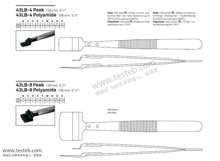 | 43LB/4PEEK-SA硅片夾 | 臺階止擋,寬13mmx長21mm [43LB/4-SA PEEK] | 全長138mm,PEEK鑷子頭,SA不銹鋼手柄 |