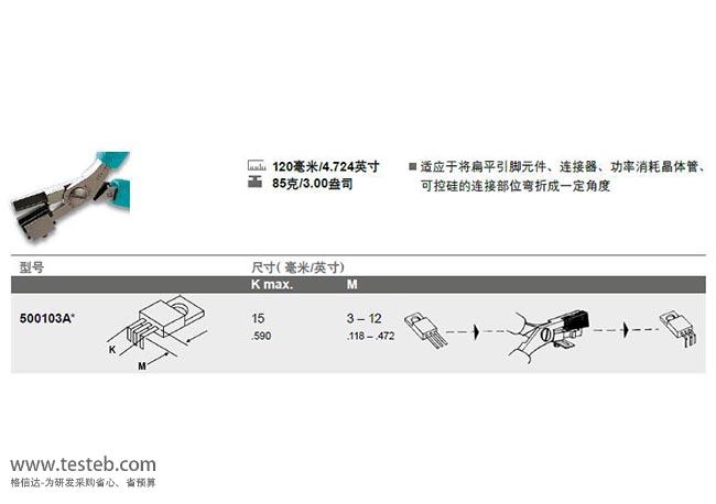 | 500103A成形鉗 | 90度 | TO220集成元件、扁平元件和晶體管、MOS三極管 | 距元件3~12mm,引腳寬度最大15mm | 適應于將扁平引腳元件、連接器、功率消耗晶體管、可控硅等有源元件的連接部位彎折成一定角度 |
