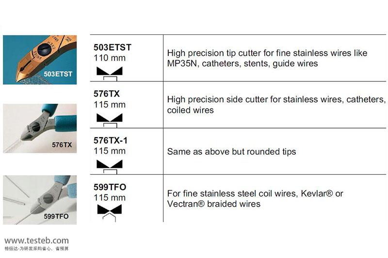 | 503ETST剪鉗 | High precision tip cutter for fine stainless wires like MP35N, catheters, stents, guide wires. 高精度剪鉗,用于精細(xì)的不銹鋼金屬絲如MP35N硬線、醫(yī)用導(dǎo)管、心血管支架、導(dǎo)線平口剪切,彎角寬頭鉗口,剪徑0.4mm鋼琴線、0.6mm硬線、0.8mm中等硬度線、1.2mm銅線 | √ | ||