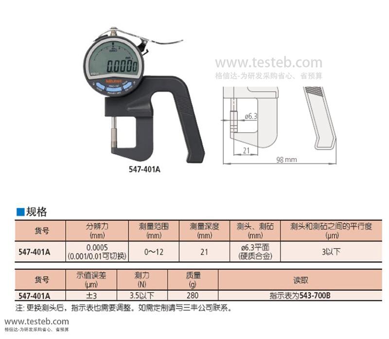 | 0-12mm | 547-401A數(shù)顯厚度規(guī) | 0.0005mm | ±3µm |