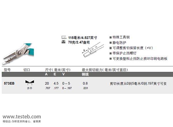 恩瑞EREM 573EB可調(diào)長(zhǎng)度剪鉗具有靈活的0~5mm可調(diào)保留剪切長(zhǎng)度,剪切直徑0.8mm銅線,帶保護(hù)止擋螺釘,可更換塑料止擋防止損壞印刷電路板,靜電防護(hù)手柄。