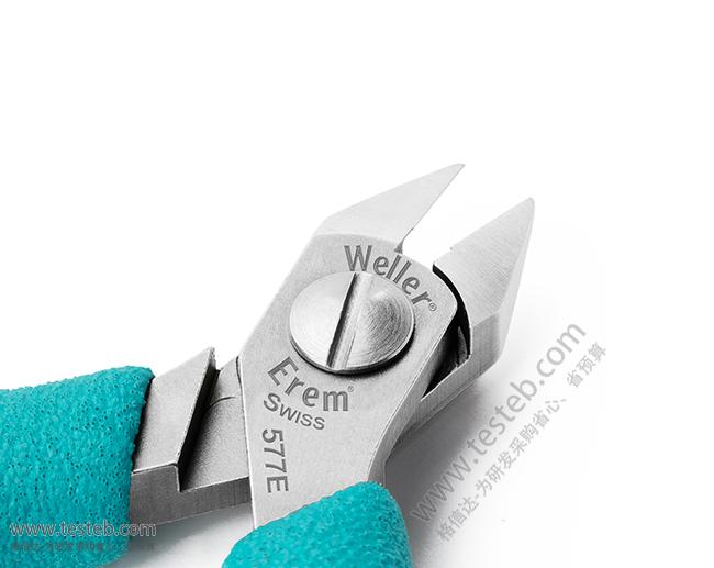 EREM 577E斜口鉗長度115mm,重量67克,具有錐形短頭,剪切口形狀為直邊并逐漸收縮為一點,該頭部形狀可以接近難以接近部位,可平切1.0mm中等硬線及1.3mm銅導線。