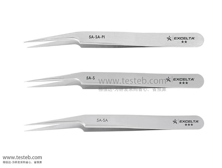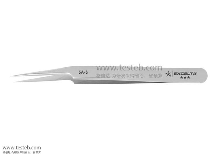 Excelta 5A-S鑷子采用Stainless steel馬氏體高碳不銹鋼(編號AISI 440),具有59HRC高硬度,比5A-SA低碳鋼款更堅硬并兼具一定的耐腐蝕性,3星高精度等級,0.13mm微彎尖頭便于操作時觀察,可在5X到10倍放大顯微鏡操作,耐高溫300℃,用于半導體和微電子組裝焊接芯片或夾持探針。