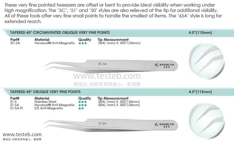 EXCELTA 5C-SA鑷子采用Neverust®抗磁不銹鋼材質(zhì)制造,具有優(yōu)良的耐酸、防腐蝕性能,抗磁性,0.13mm尖頭非常精細(xì)且保持高硬度,用于在顯微鏡下處理細(xì)微的元件,頭部彎曲10度獲得良好的操作可視性,應(yīng)用于微電子、醫(yī)療器械及生物實(shí)驗(yàn)領(lǐng)域。5C-SA彎頭鑷子質(zhì)量等級(jí)為3等星,美國(guó)Excelta品牌,產(chǎn)地瑞士Made in Switzerland,F(xiàn)ine Tips精密尖頭可用于5X~10倍數(shù)顯微鏡下操作。5C-SA鑷子規(guī)格文檔http://www.jwjzzs.com/download/202302/Excelta_5C-SA_Datasheet.pdf