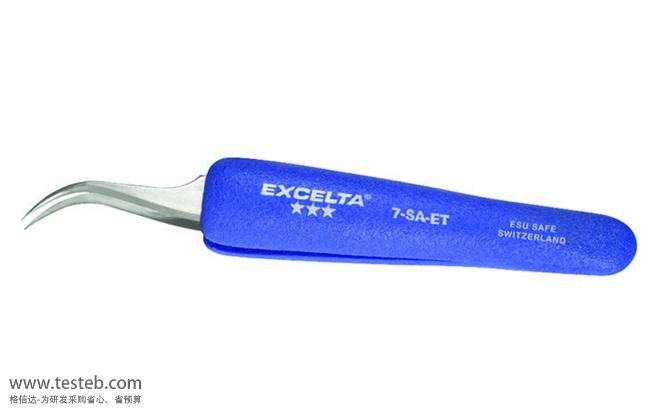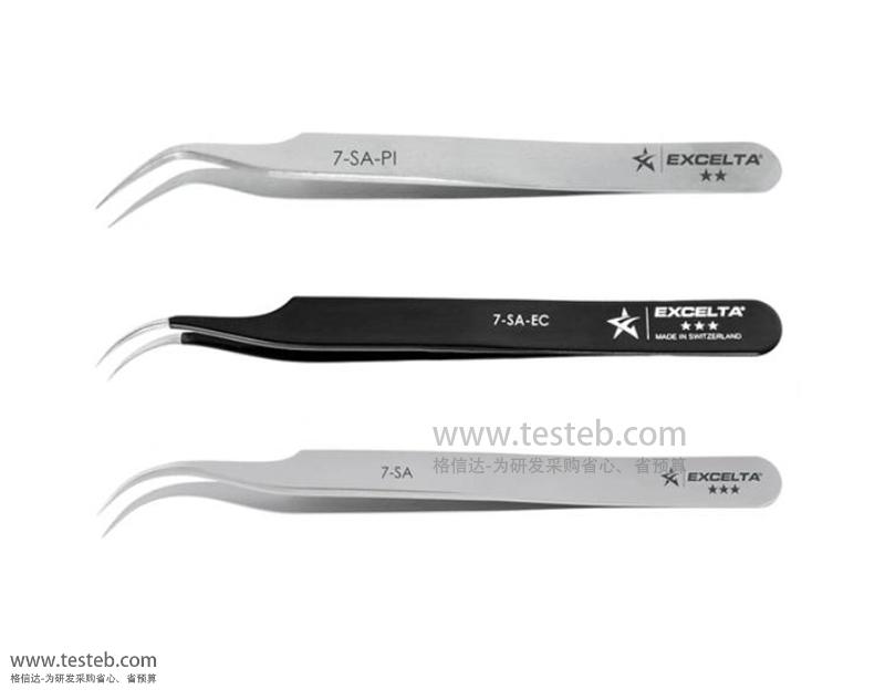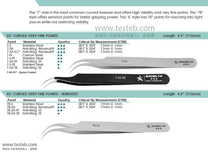 美國EXCELTA 7-SA鑷子材質為低碳奧氏體不銹鋼,具有抗磁性、耐酸防腐蝕性能,尖頭尺寸0.17mm X 0.1mm,45°彎細尖頭使其非常適于與密閉狹窄空間操作,質量等星三星級用于半導體和電子組裝應用,可在5-10X放大鏡下精細夾取。