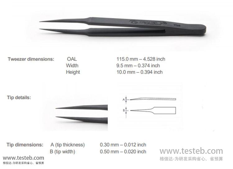 瑞士ideal-tek 705.CF塑料鑷子精細(xì)尖頭0.5mm,PA66/CF30碳纖維樹脂材質(zhì)符合ESD防靜電要求,具有良好的耐化學(xué)性如油脂、非極性溶劑,低摩擦自潤滑特性無痕夾取防克損損傷,應(yīng)用于處理細(xì)微的敏感元件、電子芯片、玻璃陶瓷等物體。另有SV高性能碳纖維增強特氟龍PVDF材質(zhì)款705.SV,它對大多數(shù)腐蝕性物質(zhì)(礦物和有機酸)和溶劑(烴、醇、鹵化物)具有出色的耐化學(xué)性,耐HF氫氟酸、硝酸、鹽酸腐蝕,耐高溫150攝氏度,ESD安全、無劃痕,用于非常敏感的組件、酸洗清潔和蝕刻工藝。705.CF鑷子規(guī)格文檔http://www.jwjzzs.com/download/202302/ideal-tek_705.CF_Datasheet.pdf