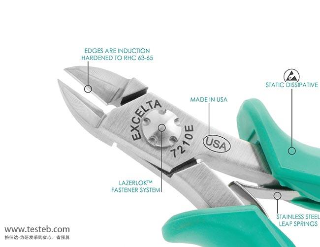EXCELTA 7140E剪鉗采用中等橢圓斜口頭設計,具有堅固的刀刃,感應淬火達到63-65洛氏硬度,剪切能力1.27mm/0.050英寸,半齊平切口,質量等級5星,全長145毫米,帶泡沫材質ESD防靜電雙色手柄,美國制造。