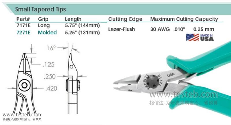美國EXCELTA 7171E剪鉗刀刃經過感應淬火硬化達到65HRC高硬度,剪徑范圍0.25mm軟線,Lazer-Flush完全齊平切口效果,細錐形尖口鉗頭適合在狹小空間精細點剪切修絲操作,雙色泡沫軟手柄ESD防靜電,質量等級5星,全長145mm。