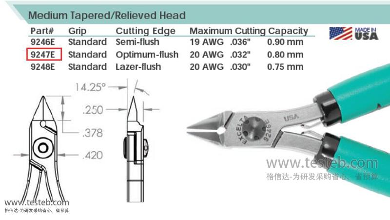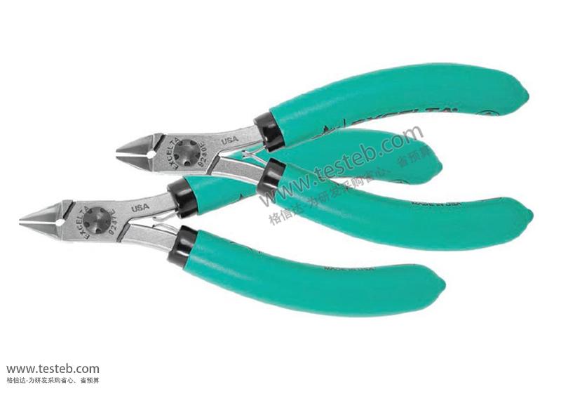 美國Excelta 9247E剪鉗具有尖錐型點剪切鉗頭,適合在受限的狹小空間精密剪切操作,碳鋼刀刃經過淬火硬化具有65HRC高硬度,剪徑范圍0.8mm,齊平切口斷面Optimum Flush,兼具堅固性和精密性,雙色泡沫軟手柄ESD防靜電,鉗子全長115mm。