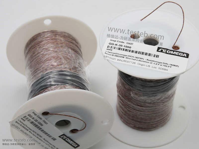 美國Omega GG-K-30-SLE K型熱電偶測溫線測溫范圍482℃,SLE特別限制誤差精度0.4%或1.1℃,30號線規線徑0.254mm,絕緣層正極黃色,負極顏色紅色,外部玻璃纖維保護層,GG-K-30-SLE感溫線可按米購買,也可整卷購買,每卷長度300米。