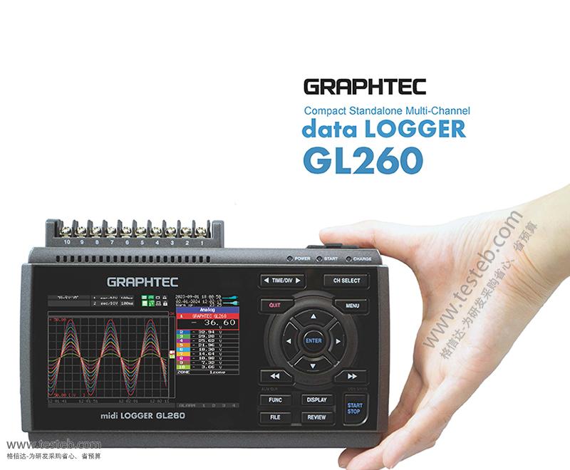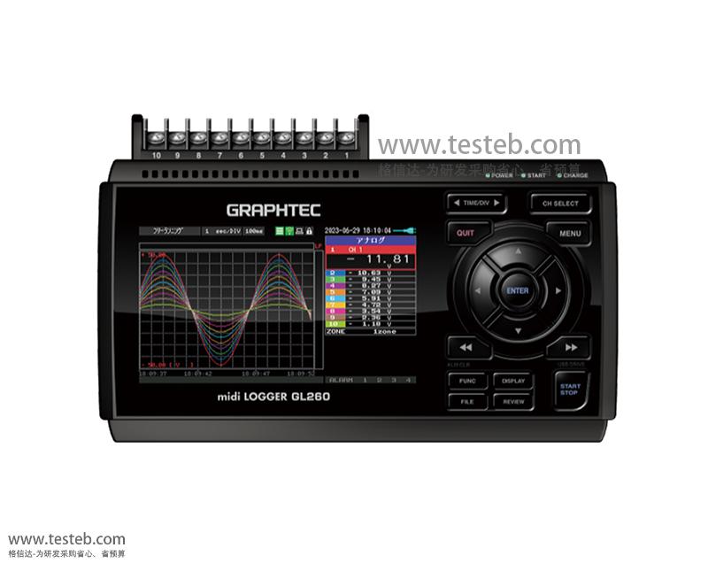 Graphtec圖技GL260A便攜式多通道數據記錄儀可以同時采集電壓、溫度、濕度、邏輯、脈沖信號、電流、電阻數據,支持所有10通道的隔離多功能輸入,采樣頻率可達1ms~1h,內置8G閃存存儲容量并可外接SD卡擴展內存,標配GL28-APS應用軟件,可選購B-573電池組滿足室外操作需要,選購無線LAN模塊實現遠程監控及數據記錄。