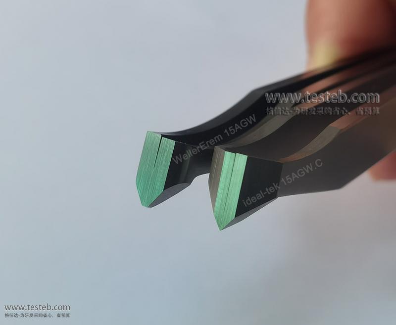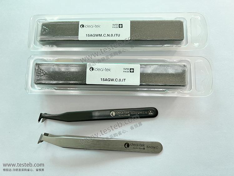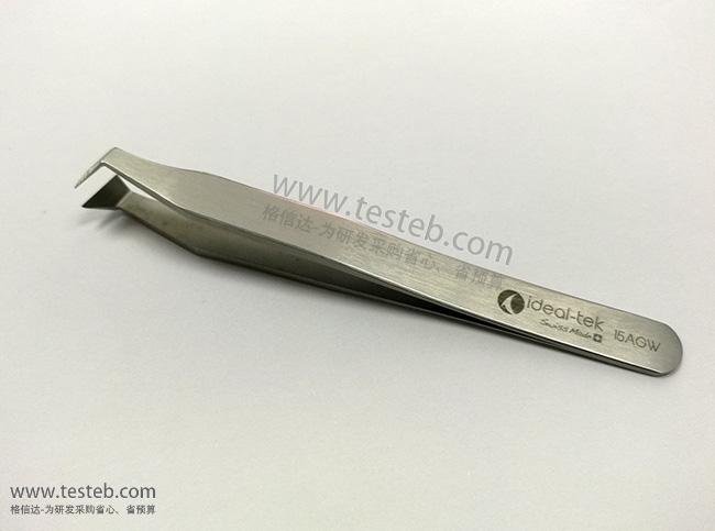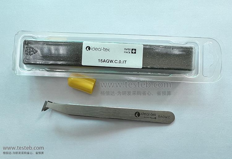 Ideal-tek 15AGW剪切鑷子用于高精度切割微細導線、游絲、金銀絲等,鑷頭寬9.5mm,斜角刀刃長10mm,高硬度碳鋼材質60HRC,切口齊平不傷線,swiss made瑞士制造,精密表面處理,訂貨代碼15AGW.C。另有特制款15AGWHM高硬度切割鑷子采用碳化物合金刀刃,可達70HRC洛氏硬度,具有更高剪切性能和使用壽命應對醫療器械硬質合金導線,如彈簧、不銹鋼絲、鉑金、銅銀線、鎳鈦絲等(Carbide inserts (75 HRc) on antimagnetic stainless steel handle, for very precise cutting of hairsprings. Extended lifetime and high cutting capacity)。