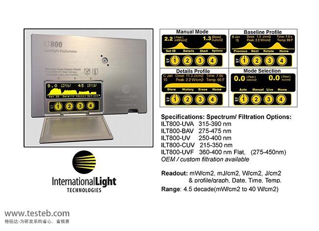 International Light ILT800輻照計響應(yīng)波長UVA 315-390 nm、UV 250-400 nm及UVC 215-350 nm、UVF 360-400nm,特殊波段可定制,輻照度范圍從mW/cm2 ~ 40W/cm2,測量采樣率3000次/秒,可存儲400000個數(shù)據(jù)點,通過微型USB接口下載及充電。ILT800 UV能量計可以分析當(dāng)前/歷史/存儲的測量結(jié)果,監(jiān)測、測量、查看并且輸出日期、時間、溫度、輻照度、劑量、校準(zhǔn)日期、型號和序列號、電池狀態(tài)。用戶可編程設(shè)置包括最低照度閾值、燈到燈測量間隔(延遲)、自動關(guān)閉時間以及自動/手動/實時測量模式。ILT800是唯一具有設(shè)備ID的輻射計,它允許用戶編程多達(dá)20個獨特的系統(tǒng)/源信息,允許用戶以一種經(jīng)濟實惠的價格為所有固化站存儲和輸出基線和歷史數(shù)據(jù)。