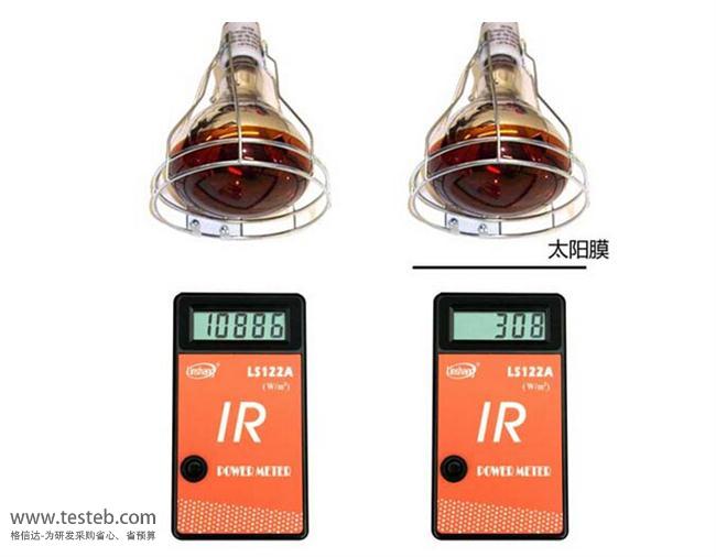 用LS122A測量紅外線光源(太陽,紅外燈等)光源的輻射強度時,探測器方向正對光源,離光源的距離為某個選定距離,按下儀器開關,開啟儀器。進行太陽隔熱膜、隔熱玻璃等對紅外線的阻隔性能測試時,第一步首先用LS122A太陽能功率計測量紅外源的紅外線的輻射能功率密度,第二步測量被太陽膜阻隔后的紅外源的輻射強度,保持紅外源與儀器間距離不變,在儀器與紅外源之間插入待測太陽膜或隔熱玻璃,記下有太陽膜時紅外線的輻射能功率密度。