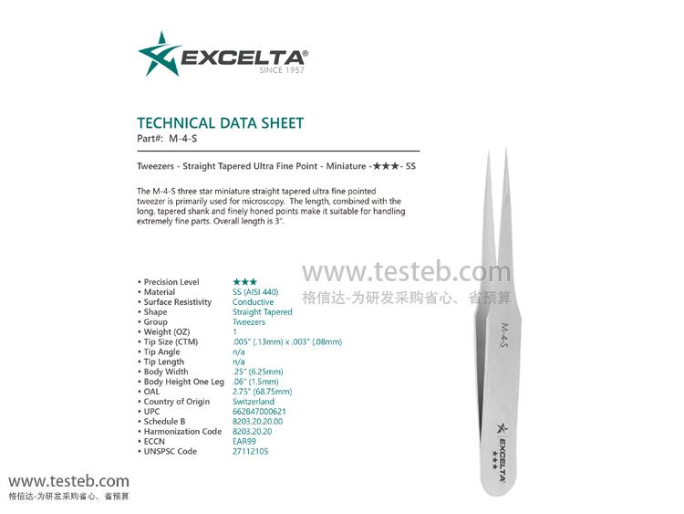 Excelta M-4-S鑷子尖頭0.13mm X 0.08mm,總長度69mm,適于5倍~10X顯微鏡放大條件下夾持細(xì)小物體精細(xì)操作,用于軍工航天、微電子半導(dǎo)體、醫(yī)療器械制造、學(xué)校實(shí)驗(yàn)室研究等。EXCELTA M-4-S材料為AISI 440馬氏體高碳不銹鋼,具有59HRC高硬度,耐高溫300℃,Made in Switzerland瑞士制造。M-4-S鑷子規(guī)格文檔http://www.jwjzzs.com/download/202302/Excelta_M-4-S_Datasheet.pdf