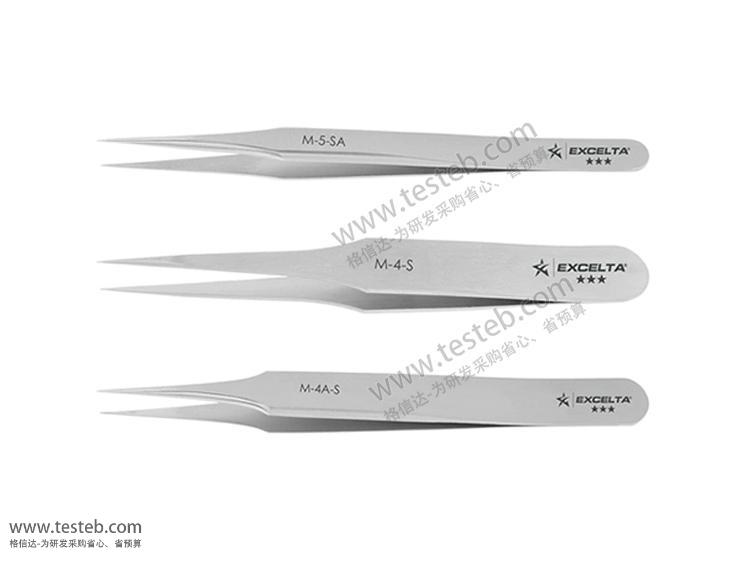 Excelta M-4-S鑷子尖部寬度0.13mm X 0.08mm薄,Very Fine Tips精密細(xì)長尖頭適合在5X-10倍放大顯微鏡下精細(xì)工作,采用馬氏體高碳不銹鋼材質(zhì)制作,59HRC洛氏硬度,耐高溫300℃,用于微電子半導(dǎo)體、醫(yī)療器械制造等行業(yè)。