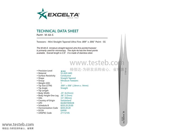 美國Excelta M-4A-S鑷子尖頭尺寸寬度0.24mm X 0.14mm厚度,總長度90mm,適用于5倍~10X顯微鏡放大條件下夾持細小物體精細操作,Stainless Steel馬氏體高碳不銹鋼材質(AISI 440),具有59HRC高硬度,耐高溫300℃,Made in Switzerland瑞士產地。M-4A-S鑷子規格文檔http://www.jwjzzs.com/download/202302/Excelta_M-4A-S_Datasheet.pdf