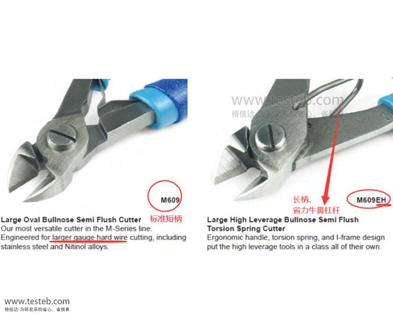 美國Swanstrom M609、M609E、M609EH系列大型橢圓頭斜口剪鉗Large Oval Bullnose Semi Flush Cutter,專為大規格硬線切割而設計,可剪切線徑范圍1.1mm以內彈簧鋼不銹鋼、鎳鈦諾合金等高硬線,半齊平切口,Engineered for larger gauge hard wire cutting,including stainless steel and Nitinol alloys。M609EH斜口鉗Large High Leverage Bullnose Semi Flush Torsion Spring Cutter, Ergonomic handle, torsion spring, and I-frame design put the high leverage tools in a class all of their own.人體工程學長手柄及高杠桿省力牛鼻設計,可防止操作疲勞。