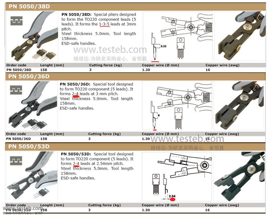| PN-5050/(*) | TO元件成型鉗,T0220元件3、5、7引腳,一次性將元件引腳折彎并保留不同長度區別,具體需求選型請聯系咨詢 | ||||