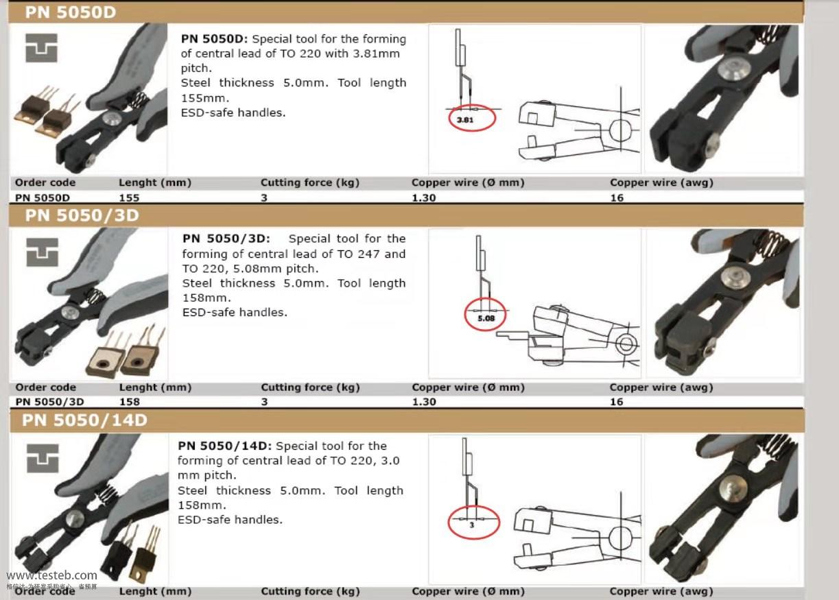 | PN5050 ESD成型鉗 | 三極管整型 | TO220元件 | 中心引腳前踢距離3.81mm | Φ1.3mm,16awg,3.0kg |