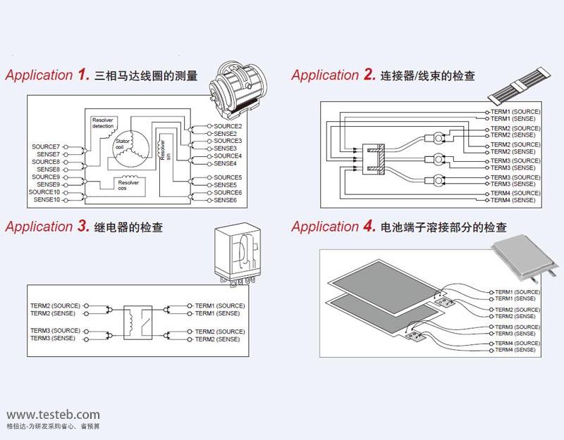 網絡電阻、轉向開關,三相馬達線圈、連接器/線束的檢查、繼電器的檢查、電池端子溶接部分的檢查等需要多點測量的地方。 通過將Z3003插入RM3545-02微歐計的背部,用4端子法最多可測量20處*掃描也可測量 (*使用兩個Z3003時,2端子最多可測量42個地方) |