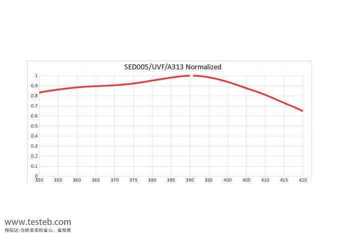 大多數UV紫外線探頭過濾器具有鐘形光譜曲線,峰值相當窄。為了提高UV LED測量系統的精確度,美國ILT公司將高度穩定的InGaAsp傳感器與平坦的玻璃濾光片和石英漫射片相結合,在用于UV固化的關鍵區域提供更均勻的響應。ILT2400輻照計+SED005/UVF/A313探頭組成的測量系統旨在簡化對UV LED曝光機固化的校準測量,專有的傳感器/濾波器/光學組件由美國ILT的工程團隊設計,可提供350-400 nm波段近乎平坦的響應。這種平坦的一致的響應允許測量和比較各種紫外LED波長,而不需要修改讀數以適應傳感器靈敏度的變化。這個系統也可以用來測量傳統的紫外線源。
