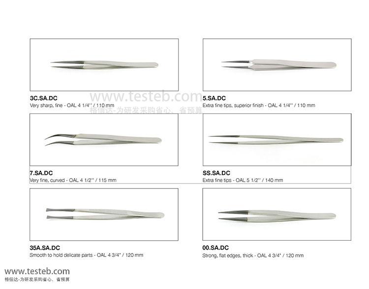 涂層適用于所有型號,訂貨后綴代碼.DC,常用尖頭、平頭及彎頭型號,SS.SA.DC鑷子具有細長的尖直頭