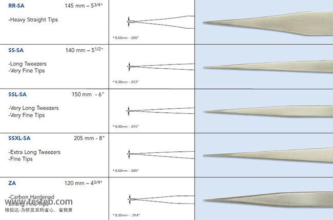 不銹鋼鑷子:SS-SA、SSXL-SA超長型、1-SA、2A-SA平頭、3C-SA堅硬尖頭、5-SA精細鑷子、5A-SA、7C-SA