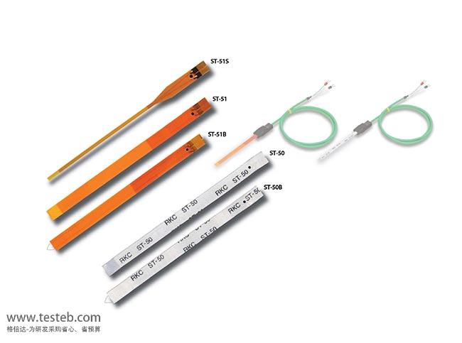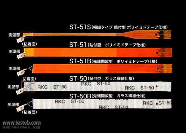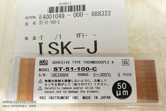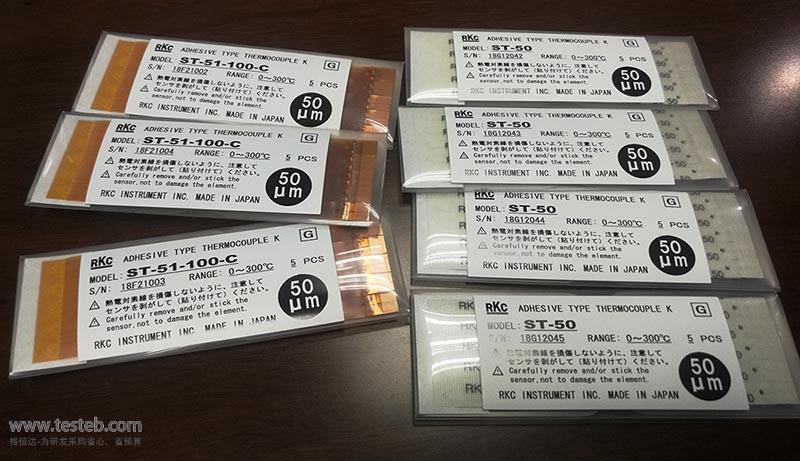 理化RKC ST-51粘貼型熱電偶厚是0.15mm的薄型聚酰亞胺樹脂款式,可使用于干凈無塵環境下貼在微小表面上測量溫度, ST-51-100-C感溫片響應時間僅0.08秒,最高可以測量300℃高溫,精度±1.3℃,可重復粘貼使用。