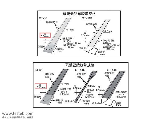 另有ST-51S窄小型平頭寬度2.3mm,ST-50B、ST-51B測溫部前端剝出,尖頭可夾進間隙測量