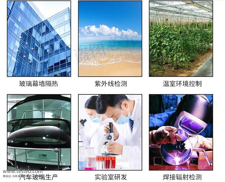 紫外輻照度測量、輻射測量和實驗室測量、紫外光固化及印刷業、燈紫外線強度與老化、工業過程監控、臨床研究及光療、半導體制造、環境監測。