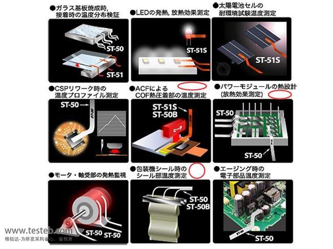 應(yīng)用舉例:玻璃基板燒成時粘接時溫度分布驗證(ST-50、ST-51)、LED的發(fā)熱散熱效果測定(ST-51S)
