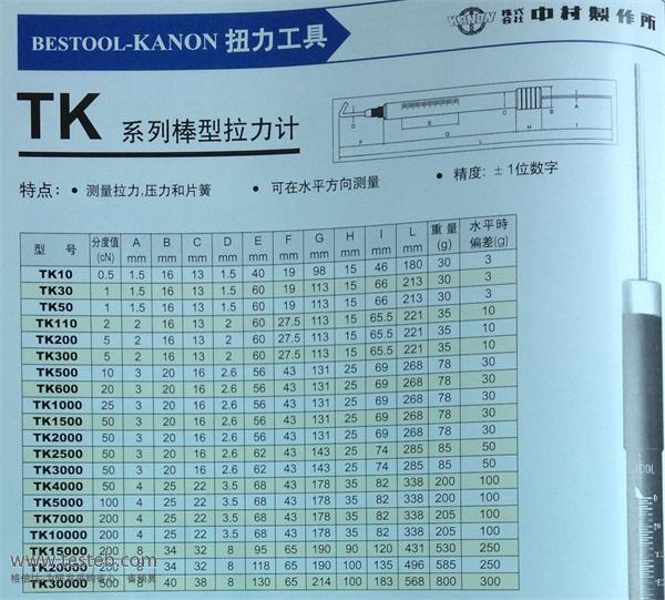 BESTOOL-KANON日本中村制作所TK系列棒型拉力計TK110型號分度值量程110g或110cN最小刻度2克,特有刻度技術即使在水平狀態,也能發揮測量的威力。