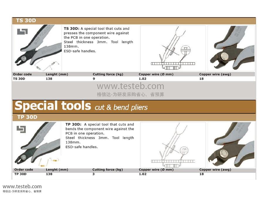 TS-30壓切鉗Cut &press pliers:一次性將二極管及電阻元件引腳在PCB板上剪切并把斷口壓扁成焊點(diǎn)狀貼緊固定,A special tool that cuts and presses the component wire against the PCB in one operation.