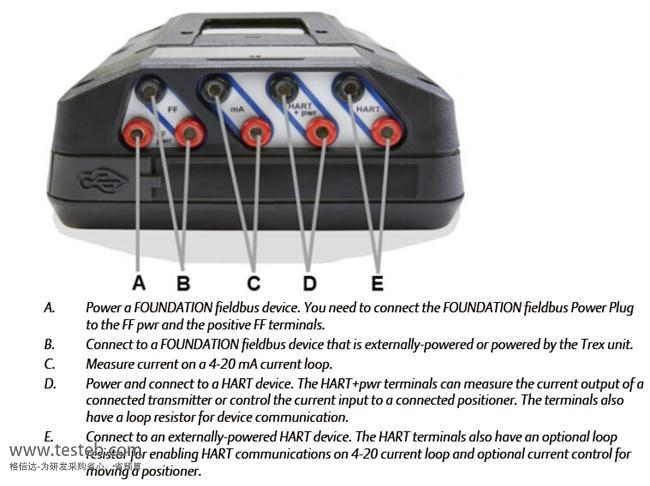 HART + 電源端子:用于HART 與Trex單元通訊,并可為一個HART 設(shè)備供電,兩個香蕉插頭,包括HART 電源、電阻器(167 Ohm)、電流控制及電流表,電流3~22.5 mA