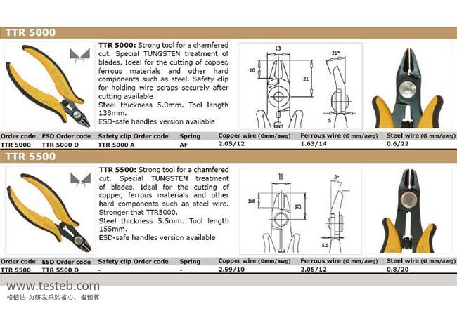 TTR 5500鎢鋼剪鉗:半齊平,橢圓頭斜口,剪徑——軟線2.59mm、中等硬線2.05mm、高硬線鎳合金彈簧鋼絲0.8mm