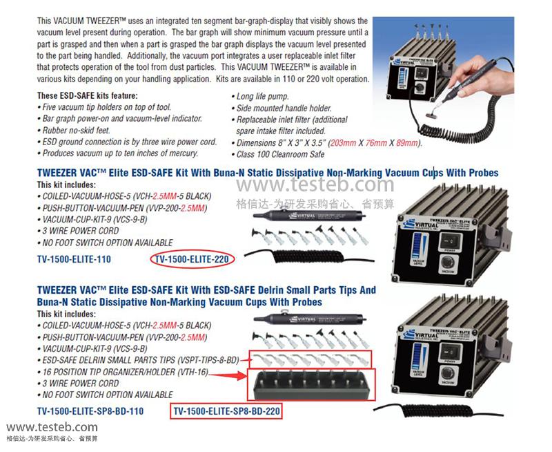 Virtual TWEEZER-VAC Elite電動真空吸筆精英型TV-1500-ELITE-220為客戶牢固吸取轉移關鍵精元件件設計,不會因真空泄漏導致元件掉落,10段條形圖液晶顯示當前操作真空度大小,端口安裝可更換的40μm接口過濾器確保免受灰塵顆粒污染。