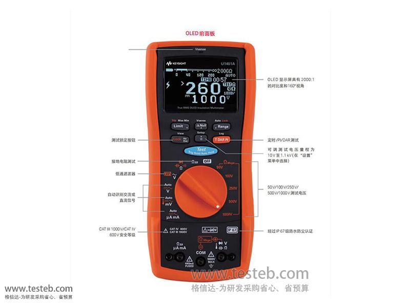 Keysight U1461A絕緣電阻表支持50V~1000V的測試電壓,高達260GΩ絕緣電阻量程,具有全功能型 4.5位OLED顯示屏,一表多用高效測試,可適用于嚴苛惡劣的測試環境。