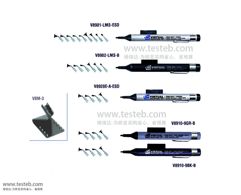 VIRTUAL PEN-VAC系列手動真空吸筆包括V8901款灰色鋁制筆身長146mm、V8902款黑色鋁制筆身長146mm、V8920E灰色鋁制筆身長127mm、V8910灰色/黑色塑料筆身長度127mm,可連接不同規格尺寸吸筆頭吸盤組成套件,用于電子元件、玻璃片、蓋板等實心平面物體吸取組裝。V8902-LMS-B手動真空吸筆包含黑色鋼筆式筆身,以及3個直頭和3個彎頭共6個吸筆頭,筆頭前端套接黑色丁腈橡膠吸盤,尺寸分別為3.18mm、6.35mm、9.53mm,表面電阻10^8-11次方歐姆為靜電消散級別防靜電,且具有耐磨、無印痕特性,可耐溫120℃,使用時手指按壓筆桿按鈕產生真空,再次按下按鈕即快速可釋放物體。