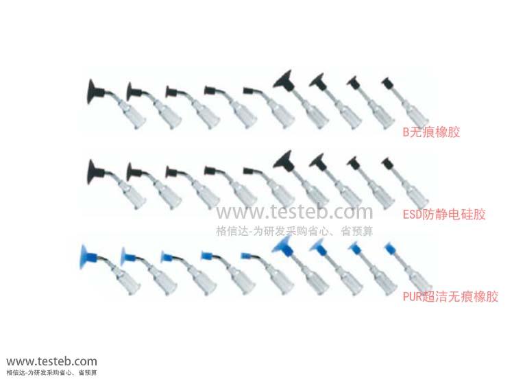 美國Virtual真空吸盤包括4種類型,BUNA-N丁腈橡膠靜電消散型具有耐磨無痕的特點,耐溫120℃,型號代碼-B;CONDUCTIVE SILICONE導電硅膠具有防靜電及耐高溫特性,表面電阻10^4-6Ω,工作溫度可達230℃,代碼-ESD;PUREACLEAN純凈橡膠吸盤非常適合吸取對殘留物敏感的物品,如鏡頭或濾光片,工作溫度250攝氏度,阻值大于10^13歐姆,型號后綴-PUR;Clear Silicone透明硅膠電氣特性大于10^13Ω,耐高溫250℃,代碼-C。
