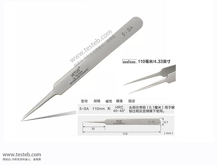 | 5-SA鑷子 | 0.1mm尖直頭 | 尖頭非常精細僅0.1mm,用于解剖實驗及顯微鏡操作 | 全長110mm,尖部長30mm、尾寬9.7mm |