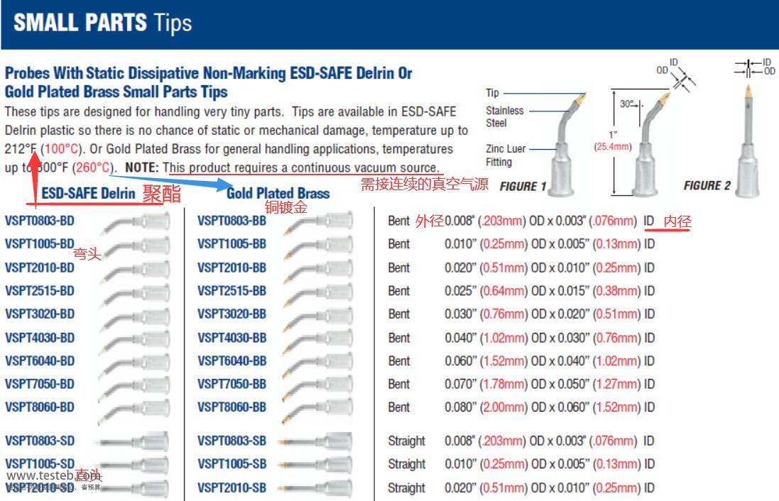 Virtual VSPT1005-SB吸筆頭彎頭吸嘴內徑0.13mm,黃銅尖部可用于高達260℃的高溫應用,可施加一定力按壓操作,