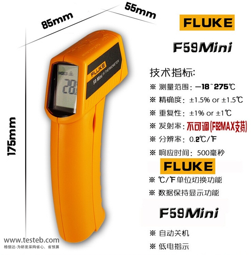 Fluke 59紅外測溫儀精準測溫,可望可及。Fluke 59是協助電氣工程師進行日常電氣維護和調試安裝工作的利器。它提供了一個快速準確的檢測物體表面溫度的方便快捷的方法,其緊湊小巧的設計讓用戶更容易攜 帶和上手操作。同時Fluke 59秉承了Fluke紅外點溫儀產品高重復性,低散射,高能量級,高耐用的特點,體現了福祿克對精準測溫的更高要求,更適應在工業環境下的精準測溫。